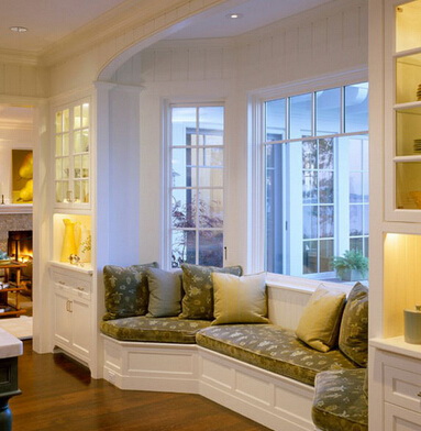 以圆拱形来顶部来划分出整个飘窗区域,飘窗处在橱柜中间段,这么看来有内嵌的错觉,很具有空间感哦。