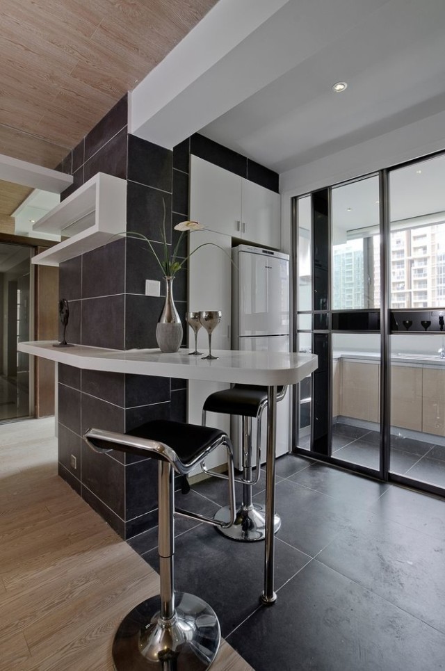 首先,设计师对房屋的结构做了一些改造,去除了部分墙体,使整个空间看起来更为连贯开阔,同时运用改造出来的空间巧妙布局,进门处除了必须的鞋柜以外,设计师更是沿着墙的转角勾划出一个简单的吧台,门厅与餐厅之间的过渡一下子生动起来。